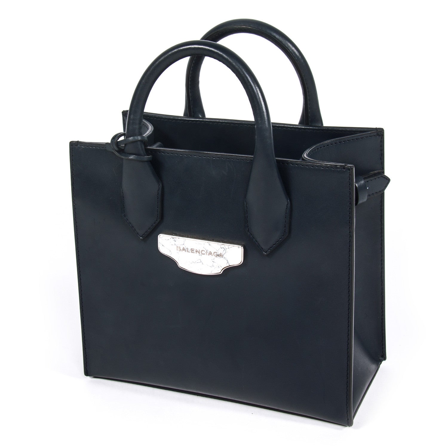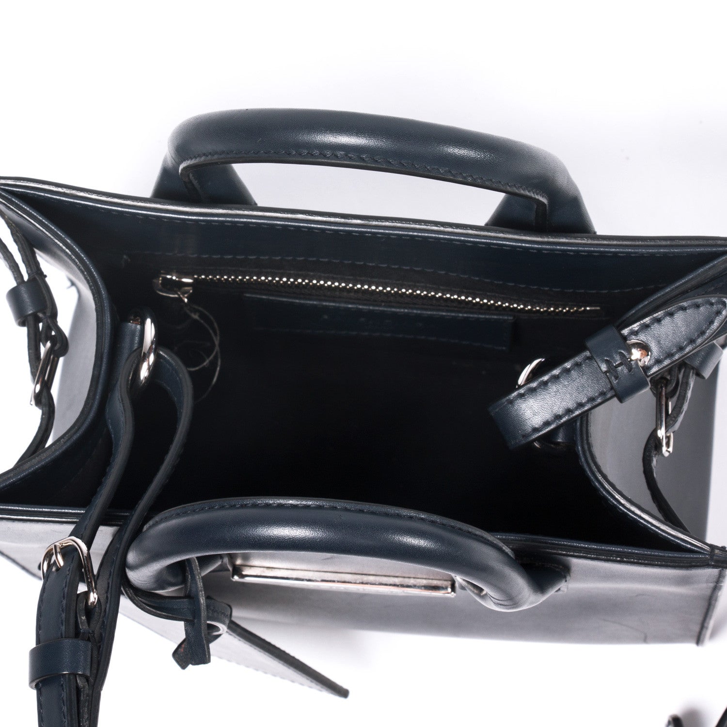 Details: Blue Navy Calf Leather Tote / Dual Top Rolled Handles / Adjustable Removable Shoulder Strap / Marble Print Logo At The Exterior Front / Squared Shape / Buckle Fastening Side Straps / Black Interior Woven Lining / Zip Pocket Inside With Dual Slit Pockets At Interior Wall