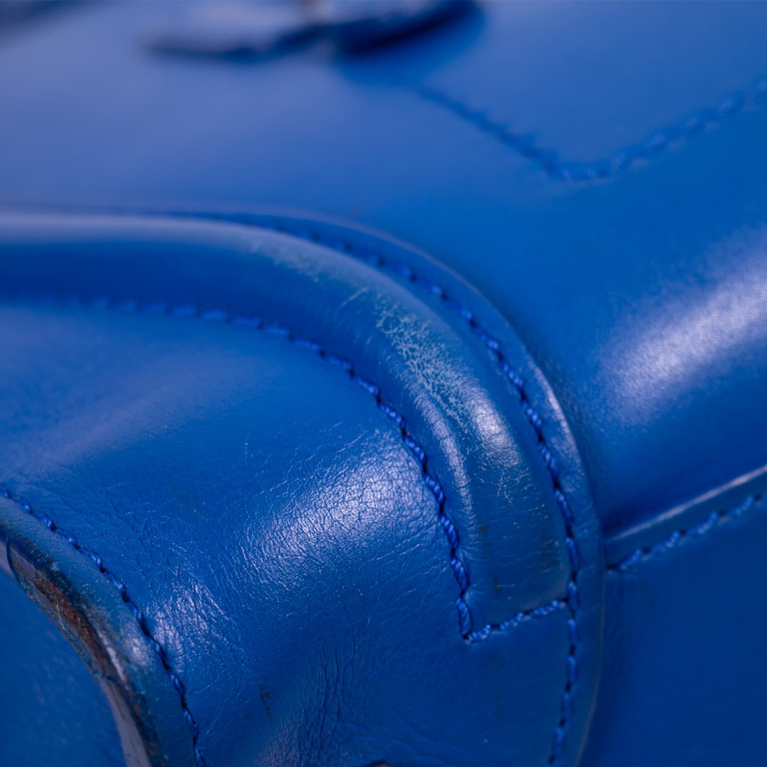 Details: Blue Calfskin Leather / Gold-Tone Hardware / Dual Rolled Handles / Small Zipper Pocket at Front / Leather Interior Lining / One Compartment / Dual Flat Pocket and Zipper Pocket at Inside / Zip Closure at Top