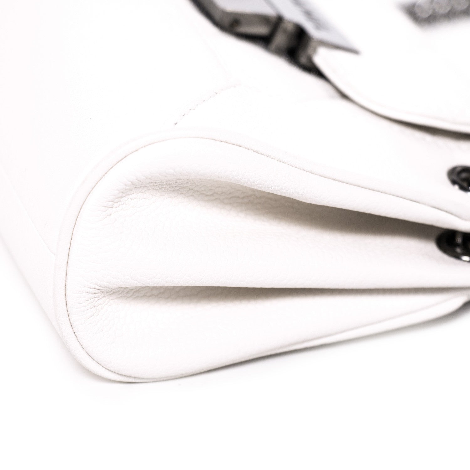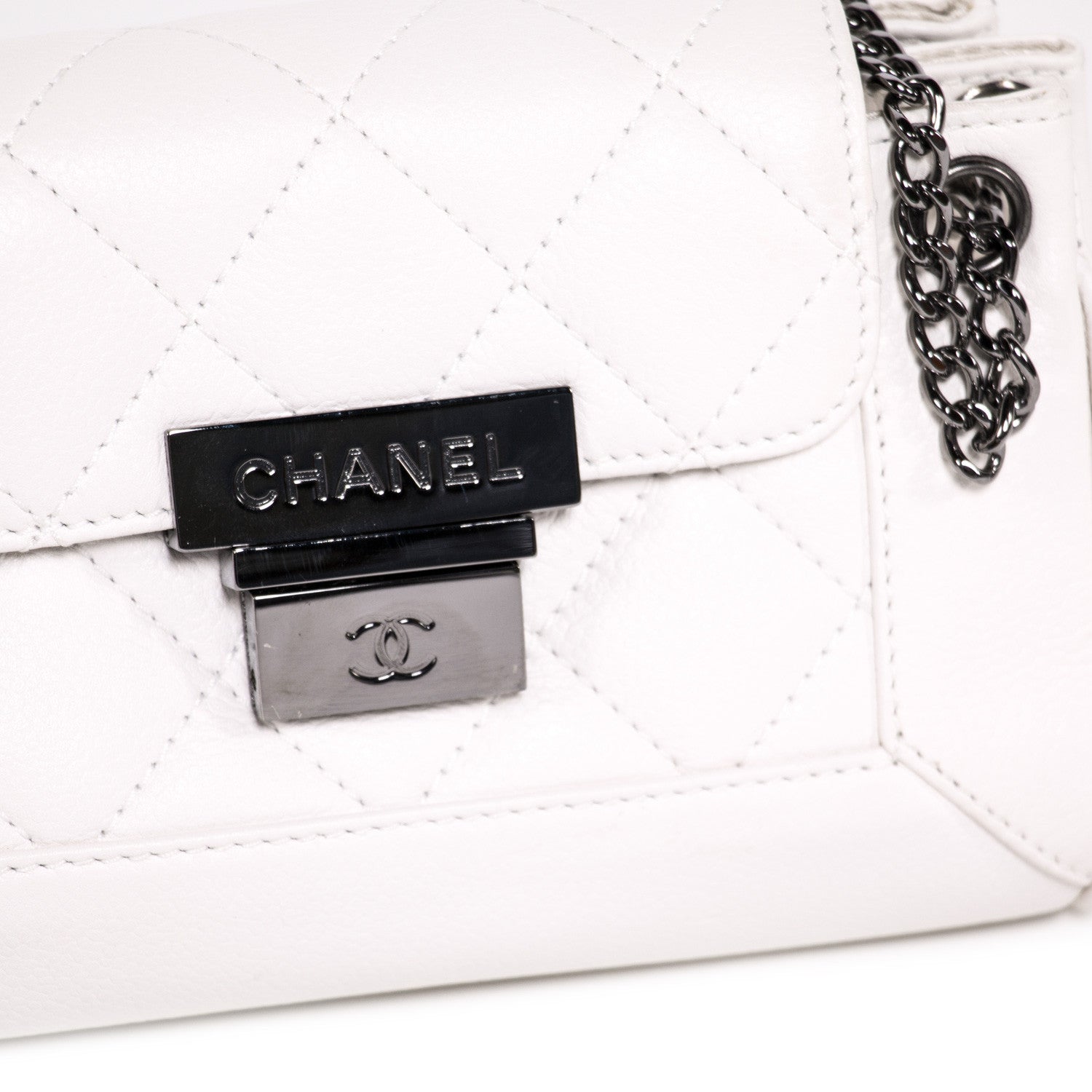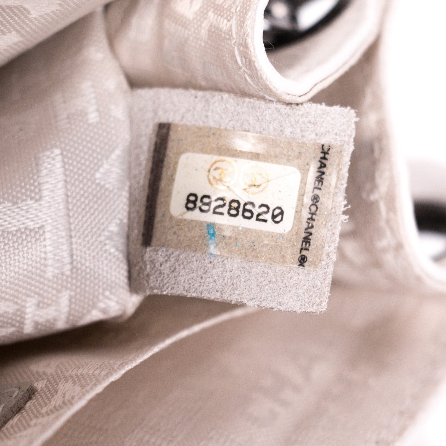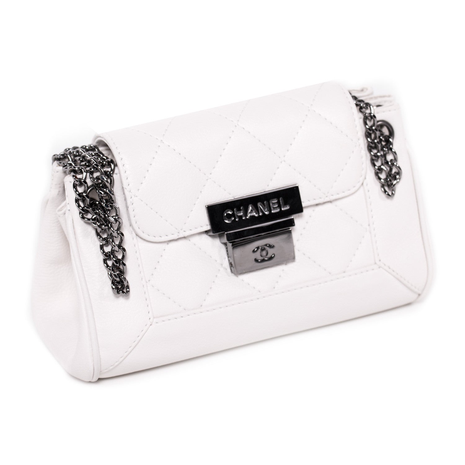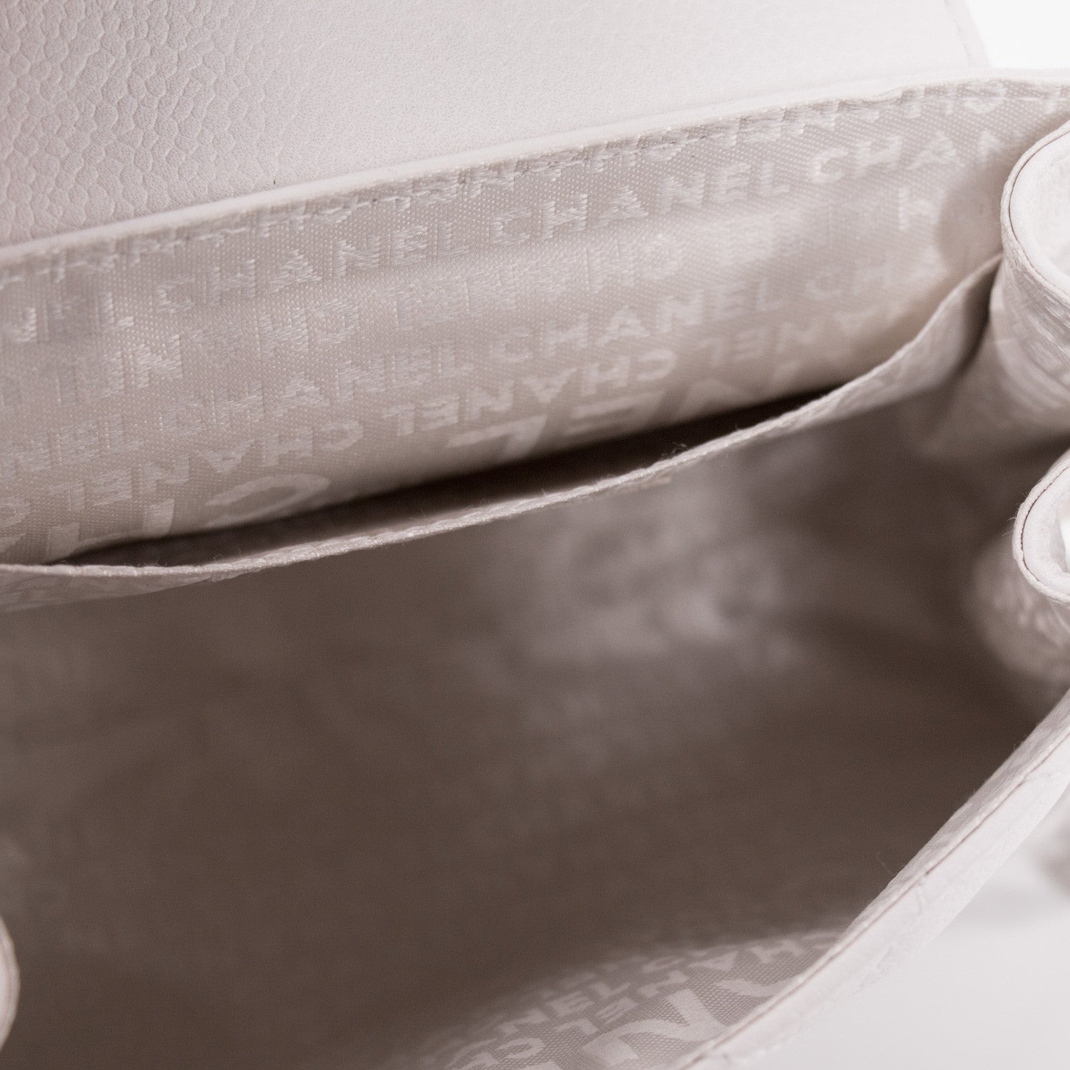 Details: White Caviar Leather / Gunmetal Hardware / Single Shoulder Strap With Double Chain-Link And Leather Accents / Quilted Leather At Flap And Front / Chanel Logo Printed Tonal Woven Interior Lining / Single Compartment With A Flat Pocket / Push-Lock Closure At Front