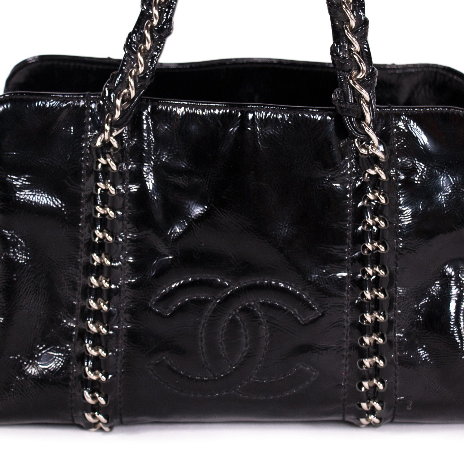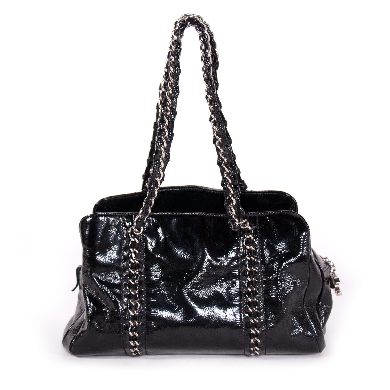 Details: Black Patent Leather / Silver-Tone Hardware / Chain-Link And Leather Shoulder Straps / Metallic Silver-Tone Leather Lining / Three Compartments, One With Zip Closure / Zip Pocket And Flat Pocket At Interior Wall