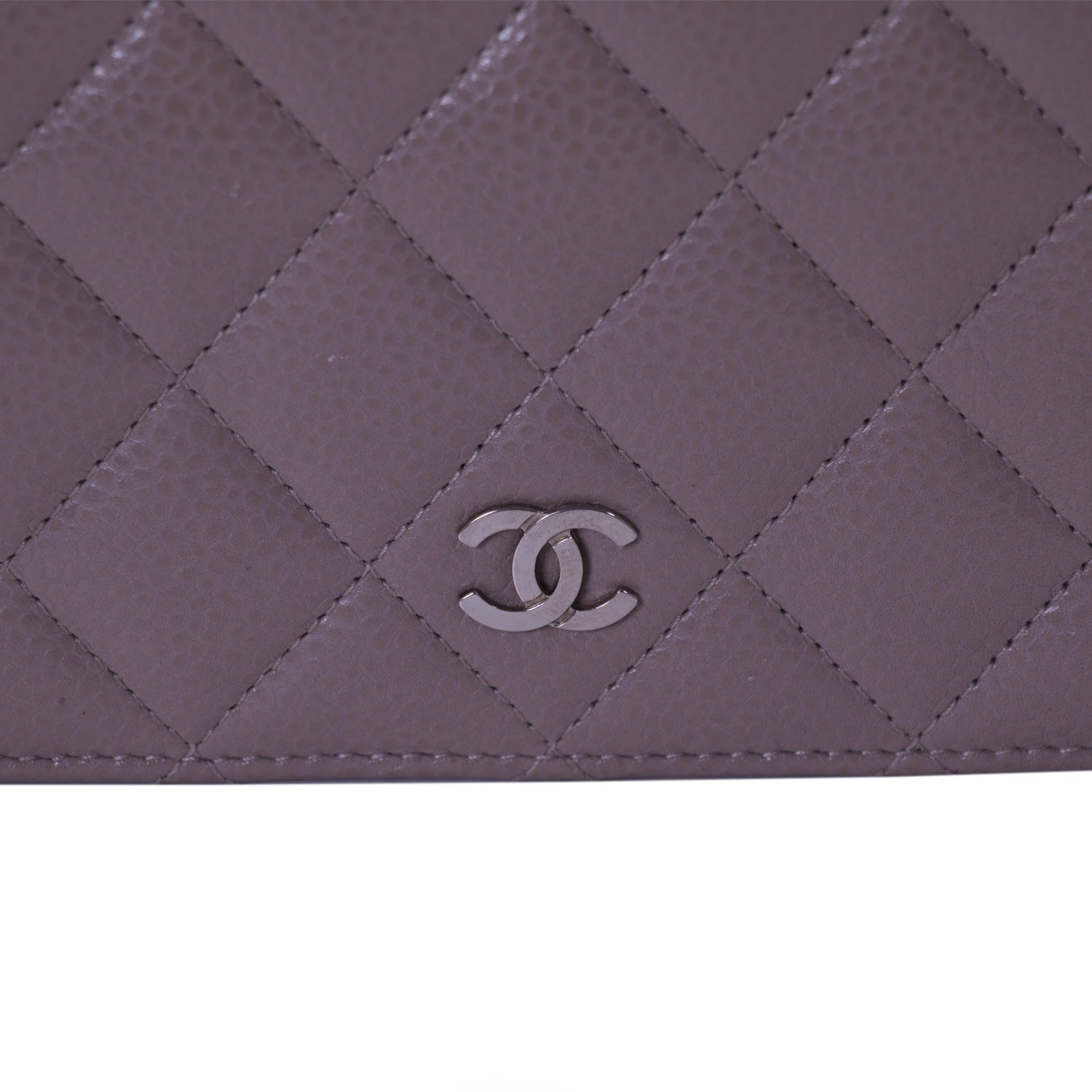 Details: Taupe Caviar Quilted Leather / SilverHardware / CC Logo At Front Face / Exterior Pocket At Back / Grey Leather Lining / Five Bill Compartment / Zipper Pocket / Eight Card Slots / Flap Closure