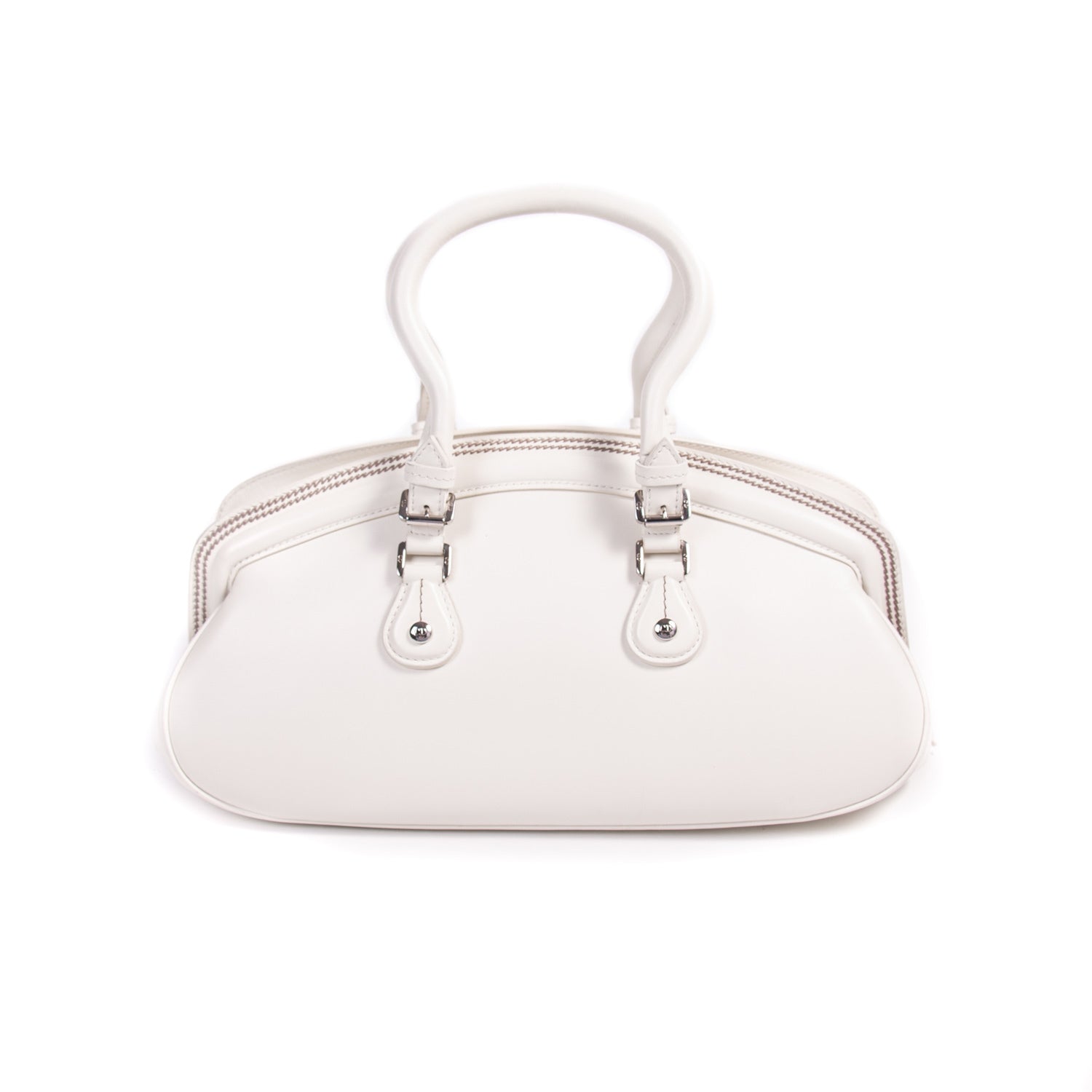Details: White Soft Leather / Silver-Tone Hardware / Dual Rolled Handles / Dual Pockets at Exterior with C & D Letters / Protective Studs at Base / Woven Print Lining / Dual Pockets at Inside / Zipper Closure at Top