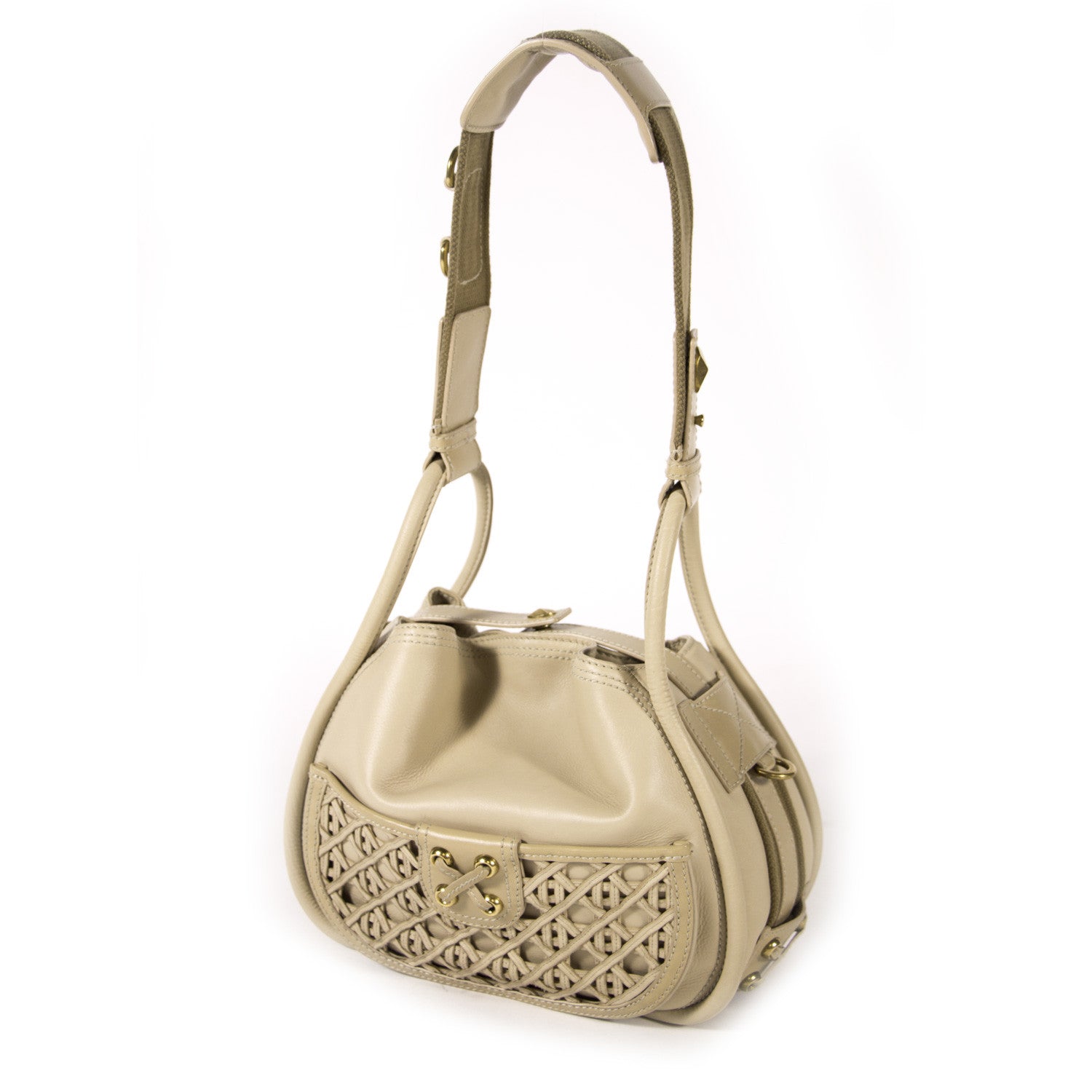 Details: Beige Calfskin Leather / Brass Hardware / Tonal Stitching / Grey Woven Accent At Base And Edges / Dual Rolled Handles / Detachable Adjustable Shoulder Strap With Metal / Exterior Pocket At Front With Snap Closure / Leather Interior Lining / Dual Pockets One With Zip Closure / Snap Closure At Top