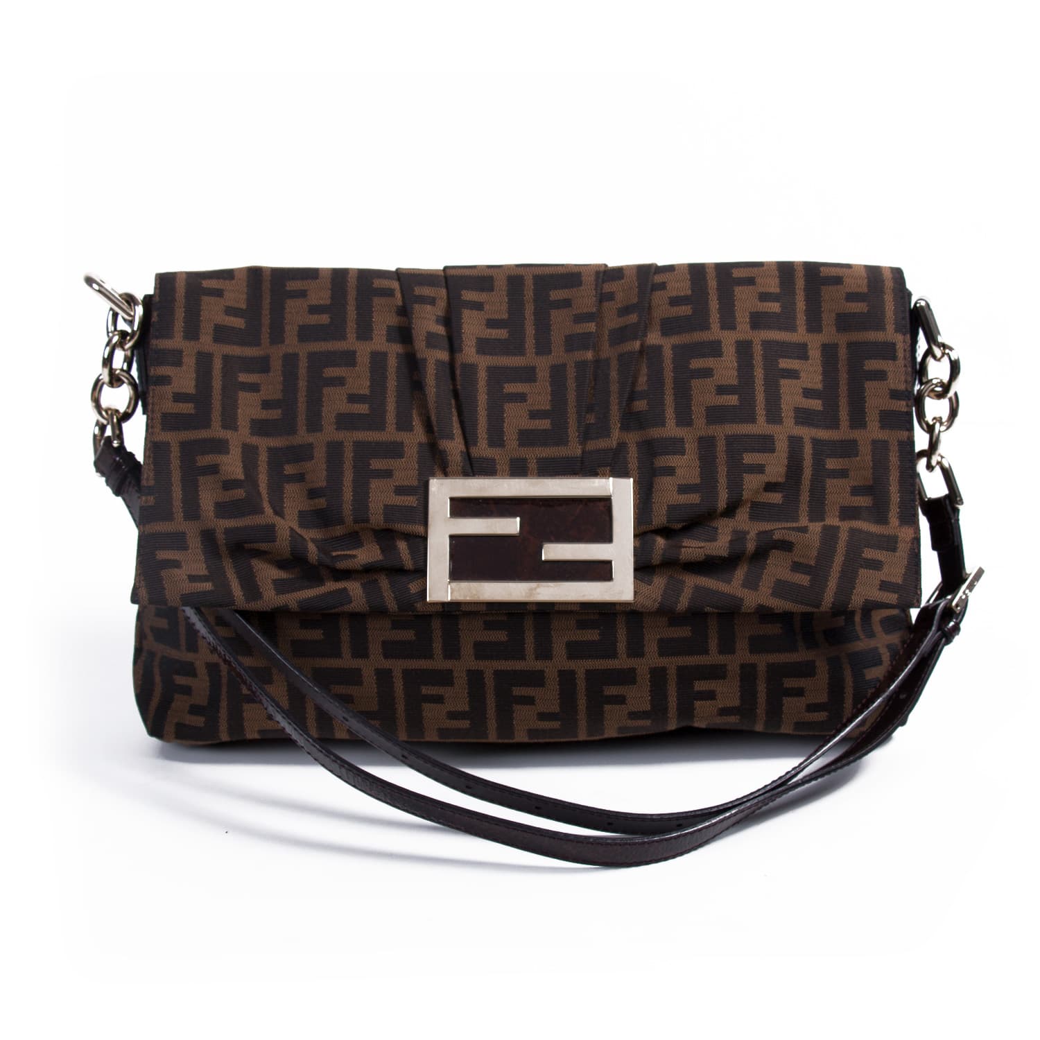 Details: Brown and Tobacco Zucca Print Canvas / Gold-Tone Hardware / Brown Leather Long Adjustable Shoulder Strap / Metal Plate Logo on the Front / Dark Grey Fabric Lining / Zipper Pocket at Inside / Magnetic Snap Closure at Front Flap