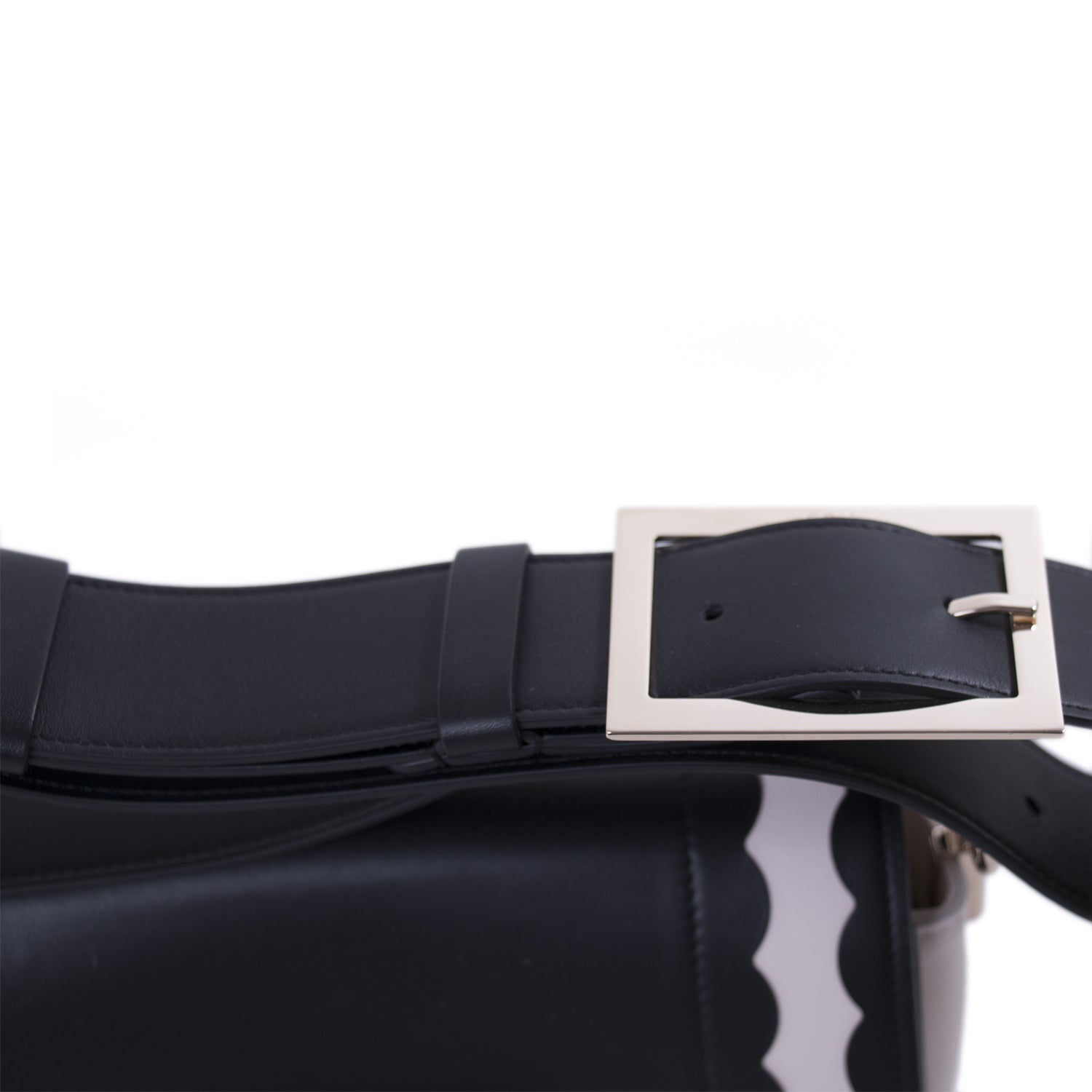 Details: Black and White Leather / Silver-Tone Hardware / Adjustable Shoulder Strap / Interior Leather Lining / Internal Zipped and Slot Pockets / Front Slit Pocket / Magnetic Snap Closure