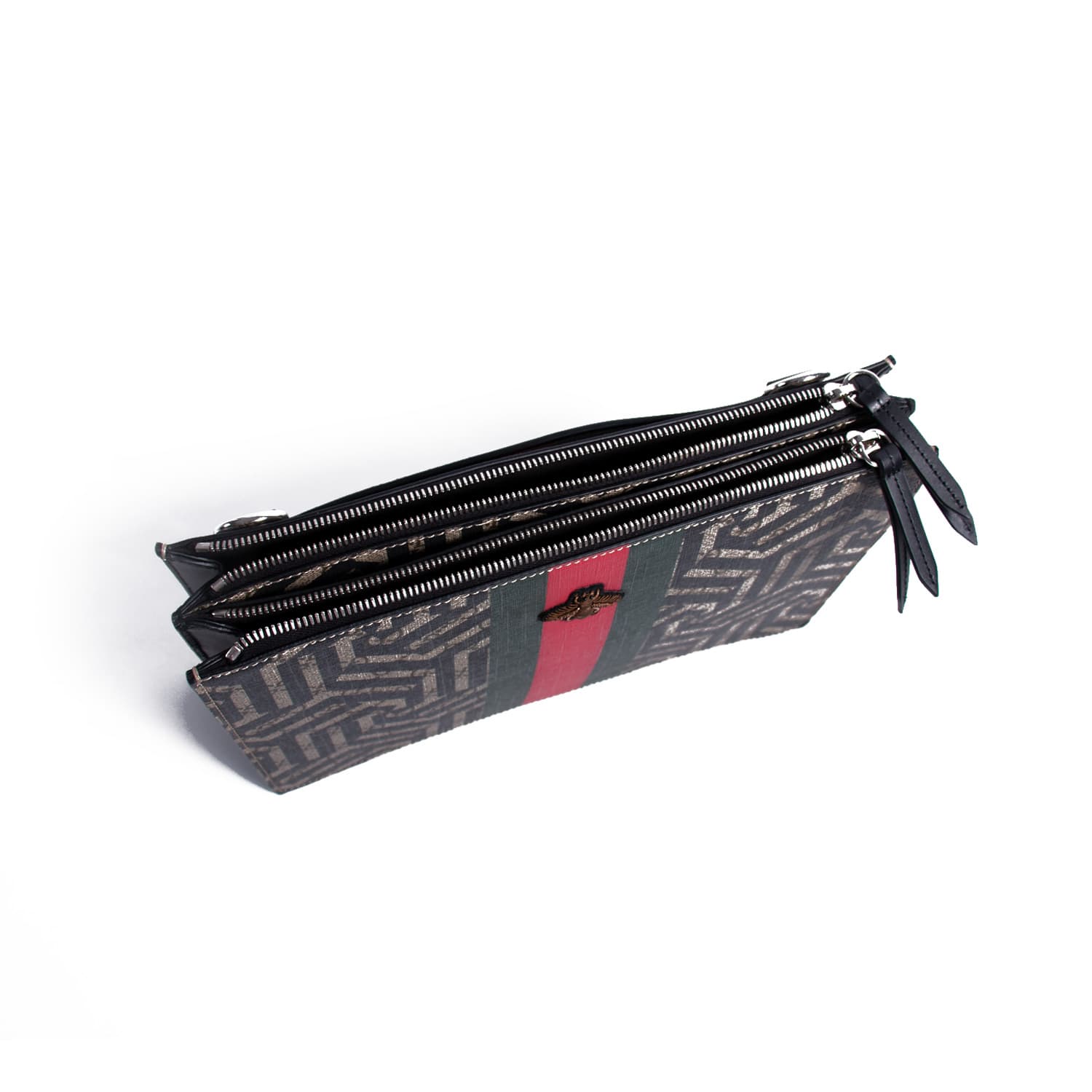 Details: Grey and Brown Coated Canvas / Silver-Tone Hardware / Detachable Leather Shoulder Strap / Handle at Back / Green and Red Stripe / Bee Embroidery at Front / Black Suede Lining / Zipper Pocket at Inside / Three Compartments, Two with Zipper Closure