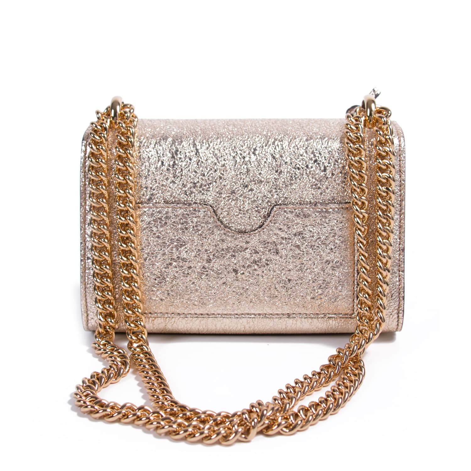 Details: Metallic Gold Leather / Gold-Tone Hardware / Chain-Link Shoulder Strap / Pocket at Exterior Back / Brown Fabric Interior Lining / Single Slit Pocket at Inside / Flap Closure with S-Lock
