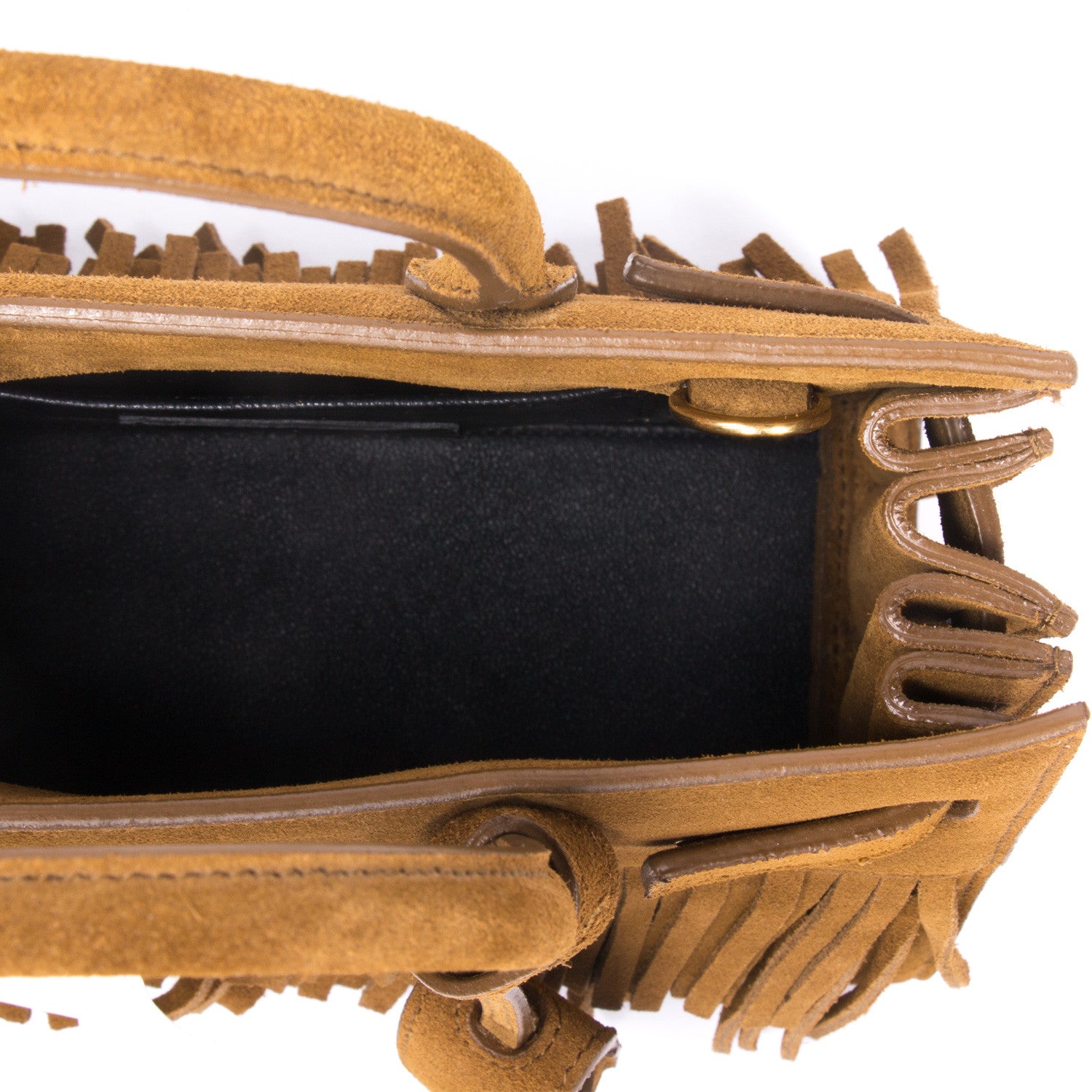 Details: Tan Brown Suede With Fringes / Gold Tone Hardware / Dainty Dual Top Rolled Handles / Adjustable Detachable Shoulder Strap / Black Interior Calf Leather Lining / Open Top / Protective Studs At Base / Single Compartment With Slit Pocket