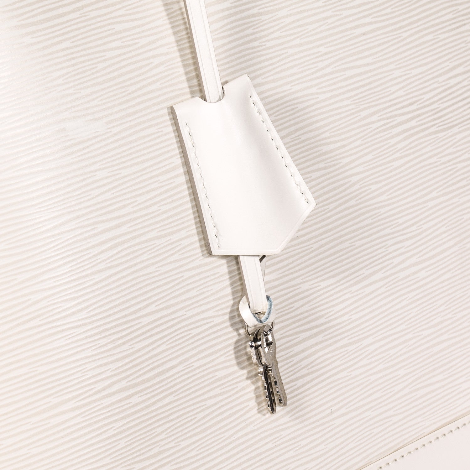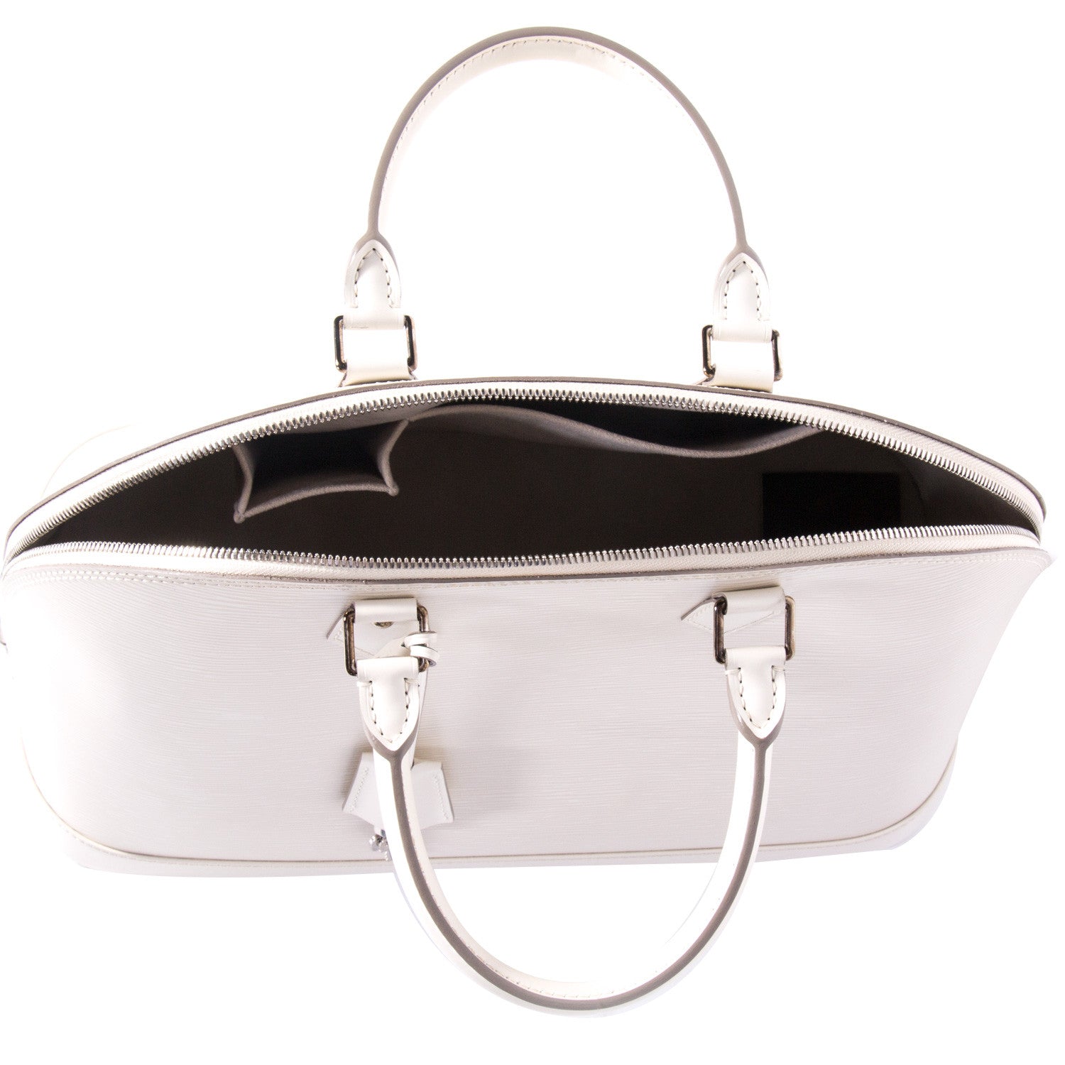 Details: White Epi Leather / Dual Rolled Toron Handles For Comfortable Hand Carry / One Interior Large Pocket / Two Smartphone Pockets / Double Zip Opening For Easy Access / Silver Color Metallic Hardware / Silver Lock and Two Keys /