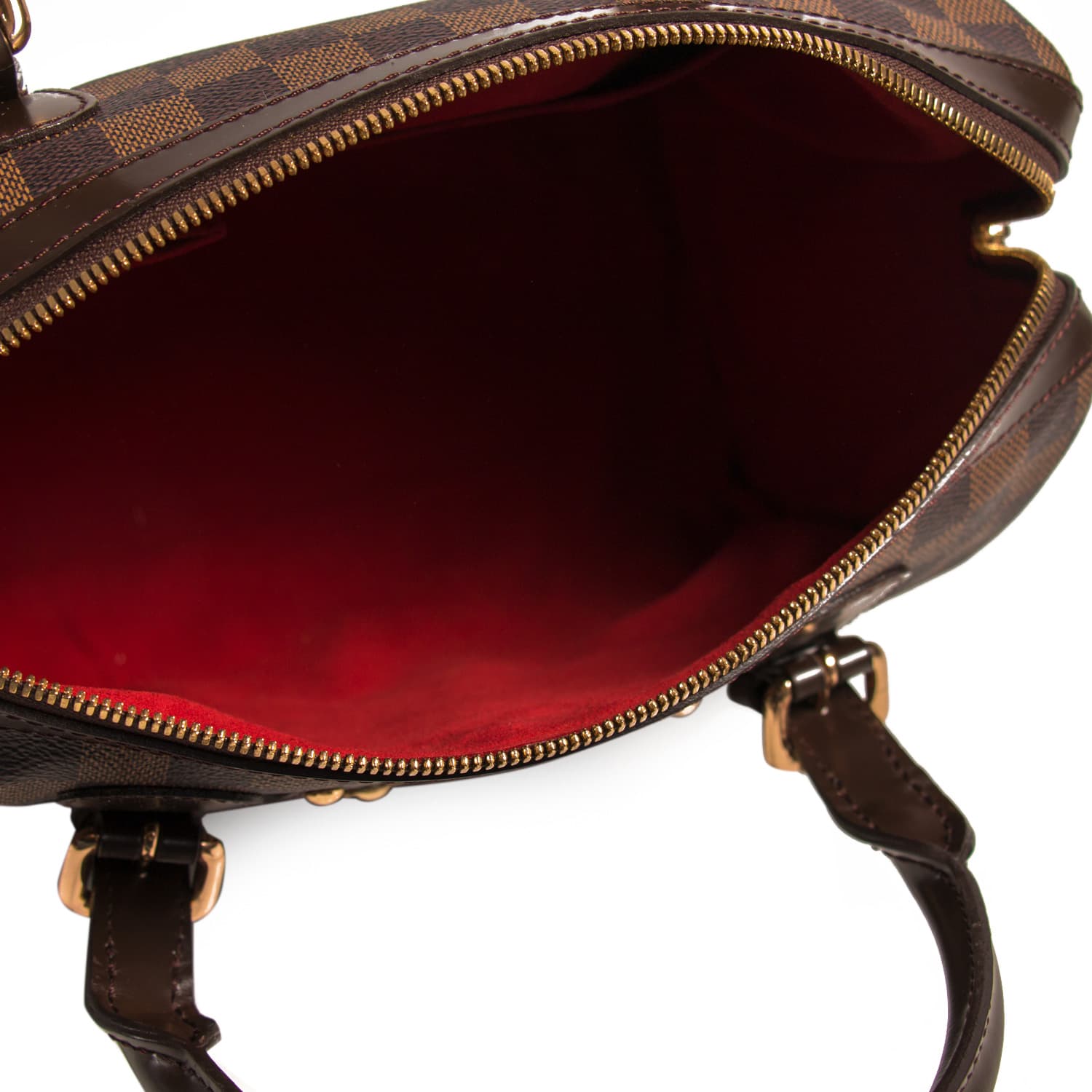 Details: Brown Damier Ebene Coated Canvas / Gold Tone Hardware / Dual Adjustable Rolled Handles / Two Exterior Pockets at Sides / Alcantara Red Lining at Interior / Dual Slit Pockets at Inside / Zip Closure at Top / Metal Plate at Front Face / Protective Studs at Base