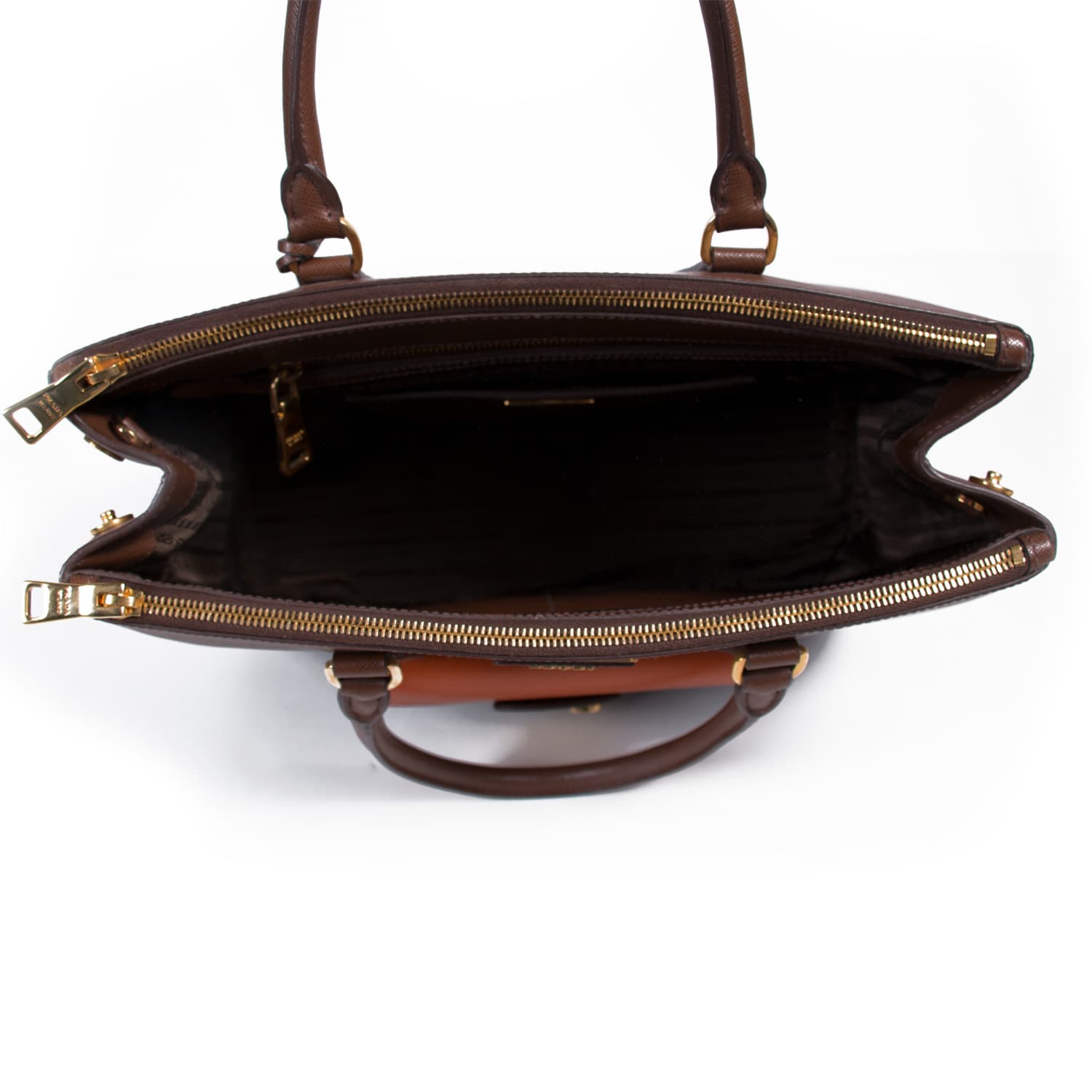 Details: Brown Saffiano Leather / Gold Tone Hardware / Dual Rolled Handles / Adjustable and Removable Shoulder Strap / Dual Zipper Exterior Pocket / Exterior Small Pocket at Front / One Zip Pocket and Three Slit Pocket at Interior