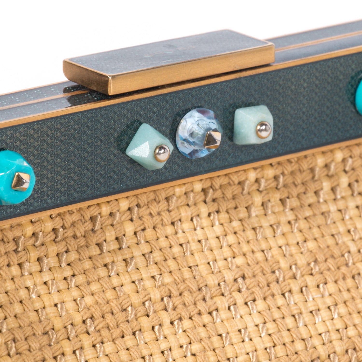 Details: Tan Raffia Prada Paglia Cocco Shoulder Bag / Gold-Tone Brass Hardware / Camel Leather Trim Featuring Contrasting Stitching / Chain-Link Shoulder Strap / Blue Metal Accent At Frame With Pearl Embellishment / Blue Leather Interior lining / Single Large Compartment With Zip Closure Pock / Push-Lock Closure At Top