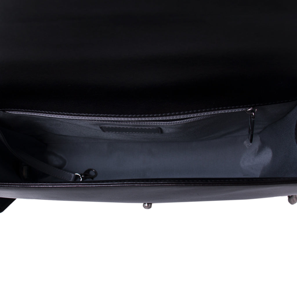 Description: Black Lambskin Leather / Brushed Metal Hardware / Chain-Link and Leather Shoulder Strap / Single Compartment / Grey Fabric Lining / Dual Slit and One Zipper Pocket at Inside / S-Lock Closure at Front Flap