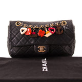 Details: Black Lambskin Quilted Leather / Gold-Tone Hardware / Chain-Link and Leather Shoulder Strap / Hearts and Other Embellishments Attached to the Chain / Single Compartment with Fabric Lining / Zipper Pocket at Inside / Turn-Lock Closure at Front Flap