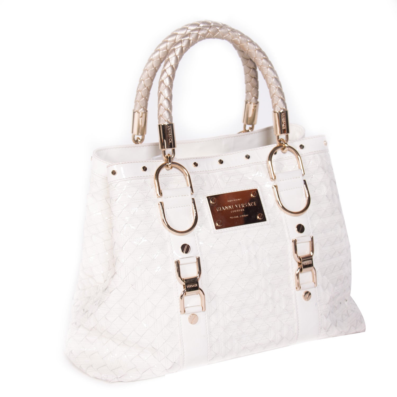 Details: White Quilted Leather / Gold-Tone Hardware / Dual Leather Rolled Handles / Gunmetal Studded Details Throughout / Interior Beige Satin Lining / Three Compartment, One With Zip Closure / Zip Pocket At Wall / Dual Flat Pockets At Interior Wal / Magnetic Snap Closure At Top