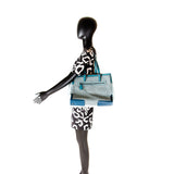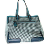 Details: Teal Intrecciato Canvas / Gunmetal Hardware / Dual Adjustable Top Handles / Leather Trim / Zipper Pocket at Front / Brown Suede Interior Lining / Single Compartment / Zip Pocket with Dual Flat Pockets / Open Top