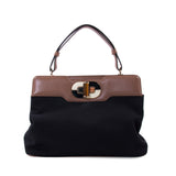 Details: Black Canvas and Brown Leather / Gold Tone Hardware / Top Handle and Leather Shoulder Strap / Pink Fabric Interior Lining / Zipper Pocket and Dual Flat Pockets at Inside / Turn-Lock Closure at Front