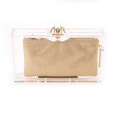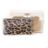 Details: Clear Perspex / Gold-Tone Hardware / Spider Embellishment at Top / Two Interchangeable Zip Pouch in Beige and Leopard Print / Magnetic Closure at Top
