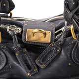 Details: Dark Grey Leather / Brushed Gold and Silver Hardware / Dual Large Shoulder Handles / Dual Exterior Slit Pockets / Buckle Expansions at Sides / Black Fabric Lining / Two Pockets at Inside, One With Zip Closure / Zip Closure at Top / Fold-Over Padlock Embellishment
