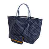 Details: Navy Blue, Brown and White Goyardine Coated Canvas / Navy Blue Leather Trim / Dual Rolled Handles / Single Compartment / Natural Fabric Lining / Detachable Pocket / Open Top