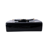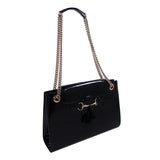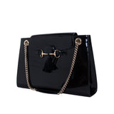 Details: Black Patent Leather / Gold-Tone Hardware / Dual Chain-Link Shoulder Strap / Tassel Adornment at Front / Natual Fabric Interior Lining with Black Suede Trim / Three Pockets, One with Zipper / Flap Closure at Top