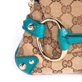 Details: Brown Monogram GG Canvas / Gold Tone Hardware / Turquoise Leather Accent And Trim / Detachable Chain-Link Shoulder Strap / Beige And Turquoise Gucci Web Panel / Horsebit Embellishment At Front Face / Turquoise Interior Lining / Single Slit Pocket At Interior / Fold-In Flap Closure At Front