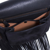 Details: Black Suede / Metal Hardware / Adjustable Flat Shoulder Strap / Dual Oversize Tassel Adornments / Black Bamboo Top Handle / Tan Interior Leather Lining / Zipper and Flat Pocket at Interior / Flap Closure
