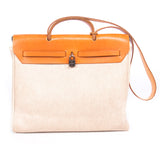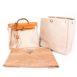 Details: Tan Interchangeable Coated Canvas Hermès Herbag GM with palladium hardware / Tan Leather Trim / Tan Coated Canvas Interior / Flat Shoulder Strap / Flat Top Handle / Pull-Through Closure at Front / Comes with Lock, Keys and Key Clochette
