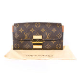 Details: Clutch Wallet / Brown And Tan Coated Monogram Canvas / Flap Front Closure / Vachetta Cowhide Interior Leather / Polished Brass Hardware Clasp / Features Central Zipper Pocket / Twelve Card Slots / Three Compartments /