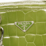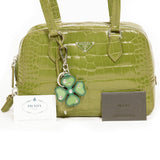 Details: Khaki Crocodile Leather / Silver-Tone Hardware / Tethered Leather Clochette / Black Woven Jacquard Fabric Interior Lining / Dual Rolled Top Handles / Single Pocket At Interior Wall With Zip Closure And Zip Closure At Top/ Comes with Prada Flower Key Chain