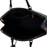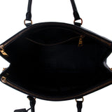 Details: Black Saffianoe Leather / Gold Tone Hardware / Dual Rolled Handles / Three Compartments, Two with Zipper Closure / 3 Pockets at Inside, One with Zipper.