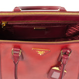 Details: Red Cerise Saffiano Leather / Gold Tone Hardware / Double Zip / Dual Rolled Handles / Logo At Front Face / Protective Studs At Base / Tonal Red Jacquard Interior Lining / Three Interior Compartments: Two With Zippers / Four Interior Pockets, One With Zip Closure