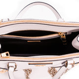 Details: White Saffiano Leather / Faceted Gold Dome Studs / Gold Tone Hardware / Dual Flat Top Handles / 4" Drop / Two Exterior Front And Back Zip Pockets Frame Open Top / Leather Triangle With Gold Logo Lettering / Black Leather Interior Lining With Single Zip Inside and Single Open Pocket / Chain For Shoulder