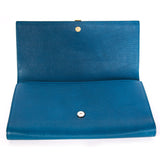 Details: Ink Blue Textured Leather / Gold Tone Hardware / Designer Logo At Front / Champagne Satin Interior Lining / Single Compartment / Single Flat Pocket At Interior Wall / Magnetic Snap Closure At Front Flap