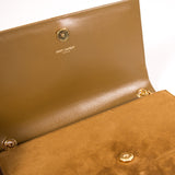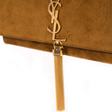 Details: Ocher Brown Suede / Gold Tone Hardware / Brown Leather Trim / Single Shoulder Strap With Chain-Link Accent / Gold-Tone Logo And Tassel Embellishments At Front Face / Brown Leather Interior / Single Slit Pocket At Wall / Flap With Magnetic Snap Closure At Front