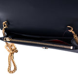Details: Navy Blue Calf Leather / Gold Tone Hardware / Logo and Tassel Endowment at Front / Chain Shoulder Strap / Two Compartments, One with Zipper / Flat Pocket and Card Slots