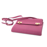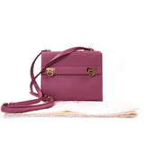 Details: Purple Grained Leather / Gold-Tone Hardware / Adjustable Shoulder Strap / Exterior Zipper Pocket at Back / Chocolate Leather Lining / Three Interior Compartments, One with Zip Closure / Dual Gancio Flip-Lock Closure at Front