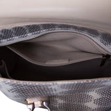 Details: White and Grey Snake Skin / Brushed Metal Hardware / Top Handle / Detachable Shoulder Strap / Suede and Leather Lining / Dual Slit Pockets and One Zipper Pocket at Inside / Gancino Flip-Lock Flap Closure