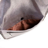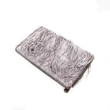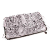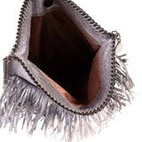 Details: Silver Metallic Shaggy Deer Fabric / Silver-Tone Gunmetal Hardware / Printed Jacquard Lining at Interior / Dual Compartments / One Zipper / Fold Over Closure / Fringes Embellishment Throughout the Exterior