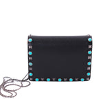 Details: Black Calf Leather / Metal Hardware / Long Chain Shoulder Strap / Blue Pearl Stud Embellishments Throughout the Front and Back / Leather and Suede Interior Lining / 3 Card Slots / One Zip Pocket / Snap Closure at Front Flap