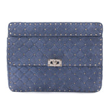 Details: Blue Slate Suede / Gold-Tone Hardware / Rockstud Spikes Throughout / Single Flat Handle / Detachable Shoulder Strap / Blue and Red Leather Interior Lining / Three Pockets at Inside one with Zipper / Turn-Lock Closure at Front Flap